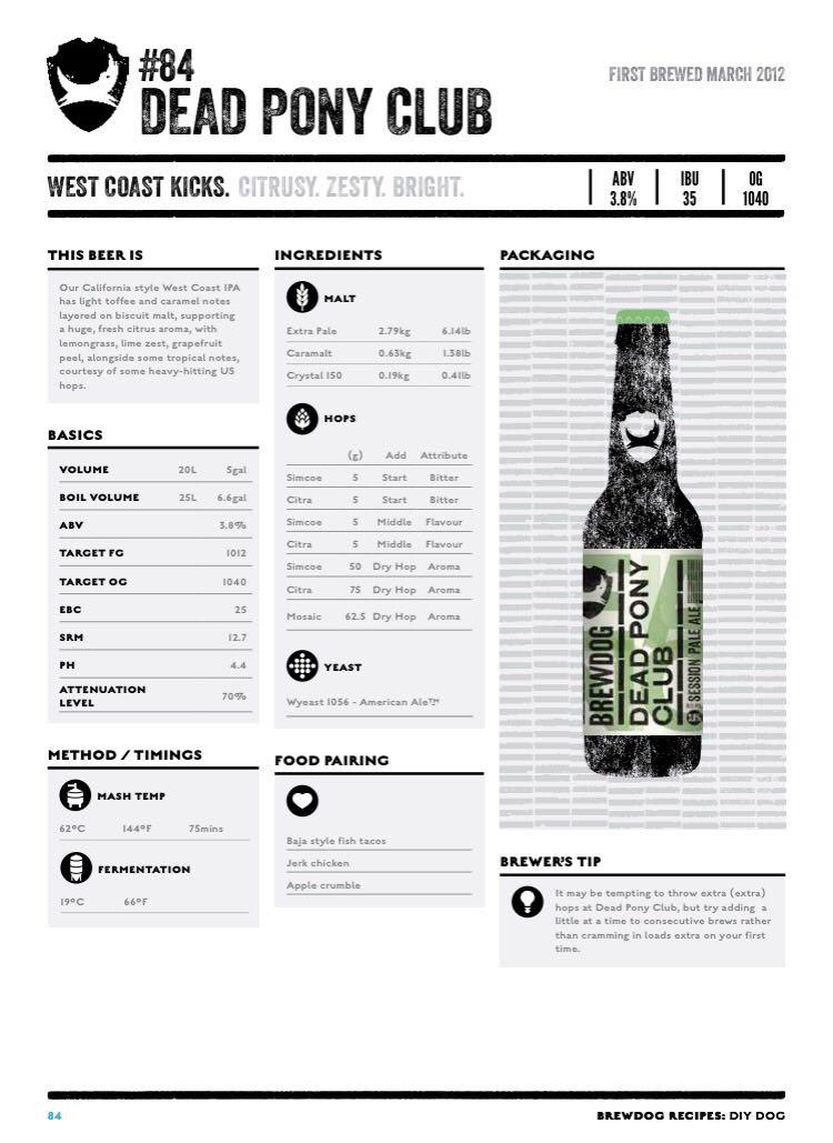 Op 25 februari 2016 heeft Brewdog al haar bierrecepten vanaf 2007 publiekelijk beschikbaar gemaakt. Het recept van de Dead Pony Club dat binnen stijl valt op smaak- en geurniveau staat onderaan deze pagina. De tweede reden dat dit recept is bijgevoegd is omdat het duidelijk inzicht geeft in het gebruik van de juiste hoppen. Helaas wijkt het alcoholpercentage wel af van de Nederlands voorgeschreven bereik.